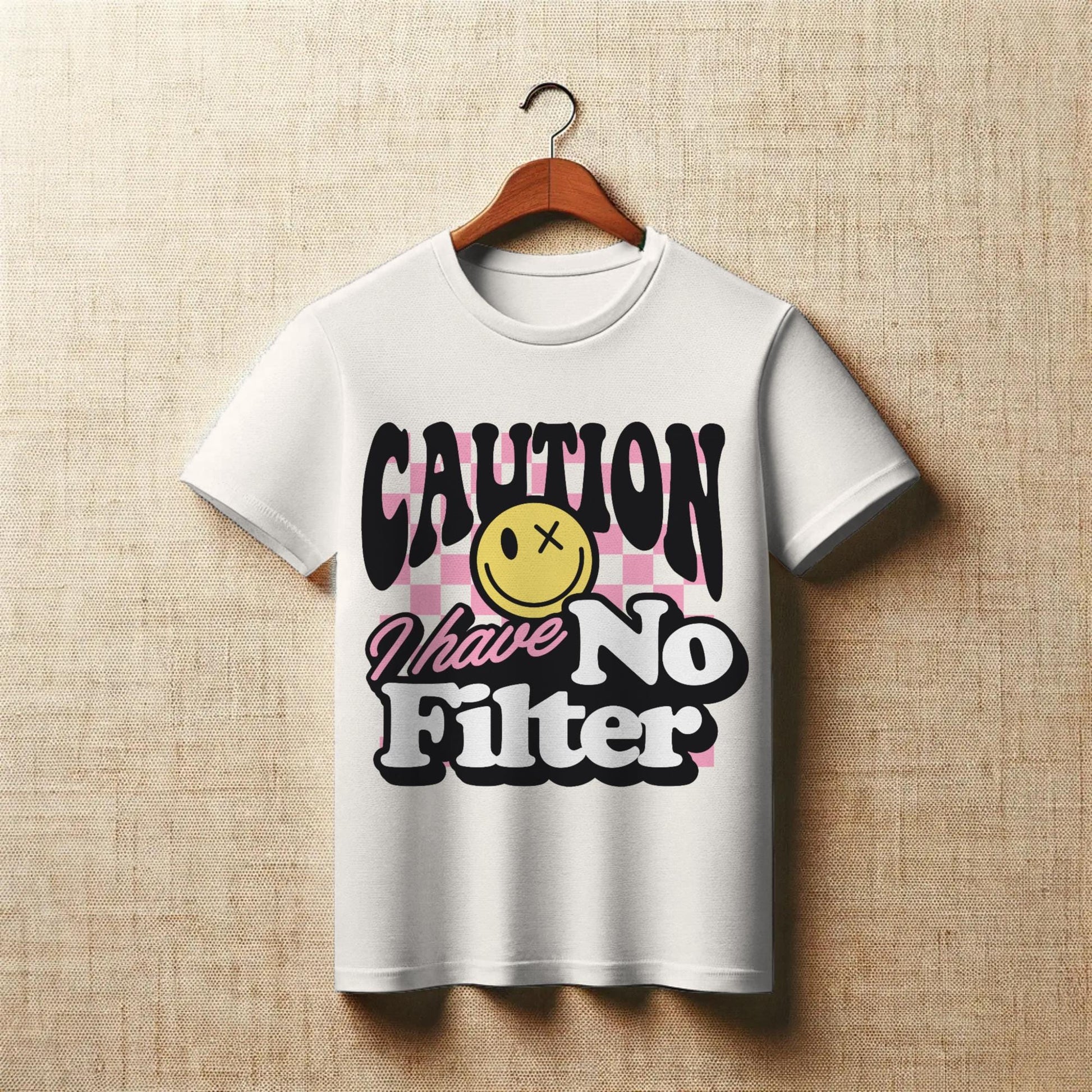 Warning: honesty ahead. This eye-catching t-shirt features a bold checkerboard background, a yellow smiley with an X-eye twist, and the unapologetic message “CAUTION I have No Filter.” With a mix of playful fonts and vibrant colors, this design is perfect for those who speak their mind and own their vibe. Printed on a soft green shirt, it’s ideal for casual wear, gifting your sassiest friend, or making a statement wherever you go. Whether you're dropping truth bombs or just embracing your unfiltered self, this tee brings the attitude.