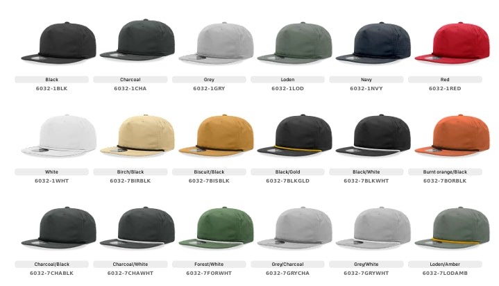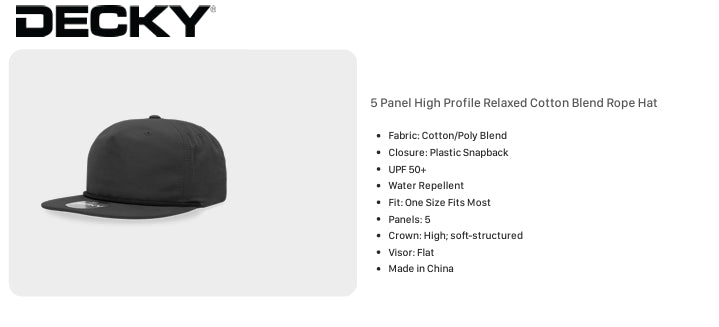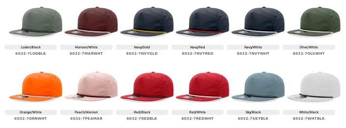 The Classic Rope Cap is a soft-structured 5 panel cap featuring a flip-up buckram, braid at the base of the crown and a retro flat bill style. It has an integrated cotton sweatband, ventilation eyelets and is finished with a plastic snap closure for a perfect fit.