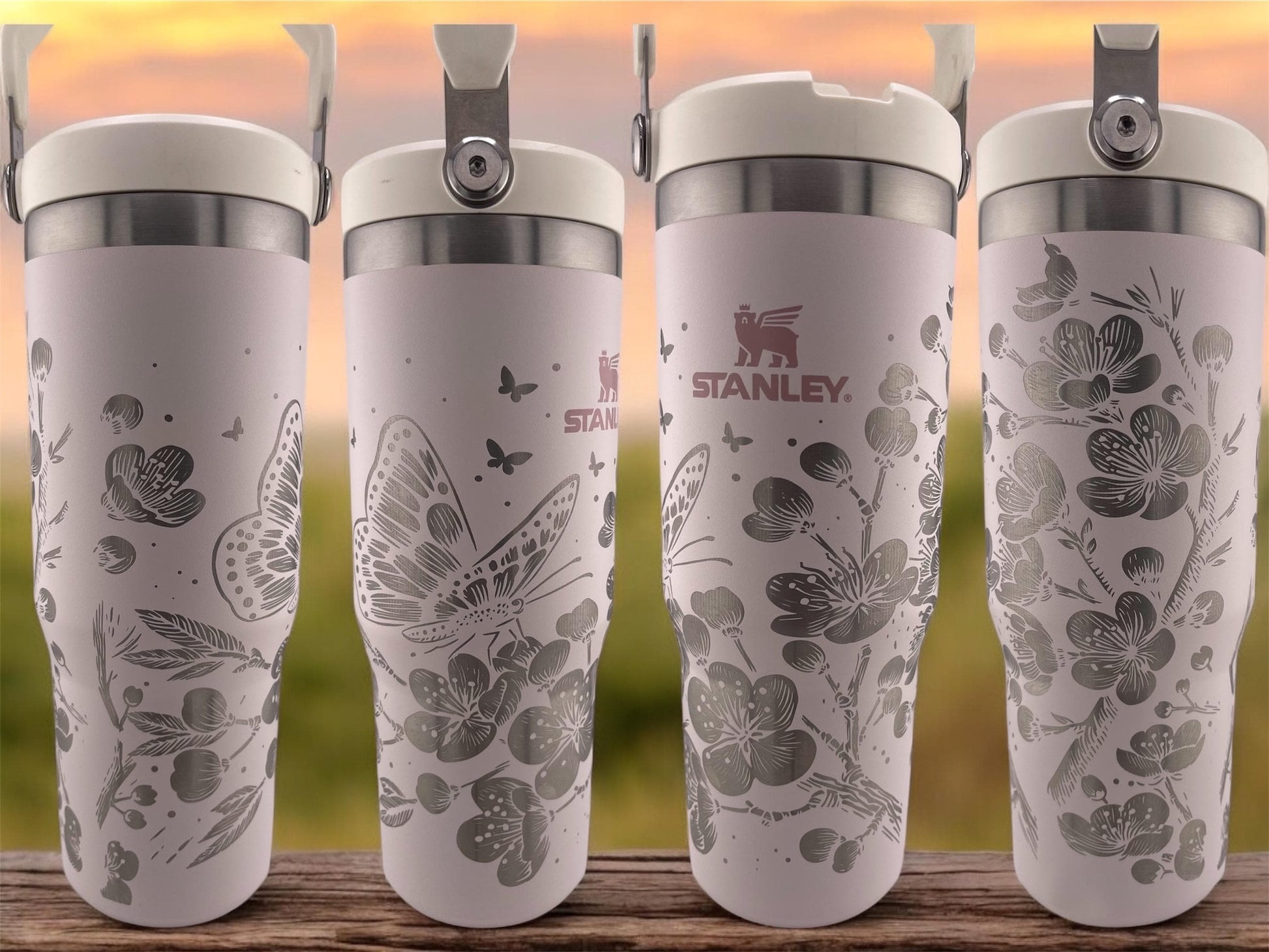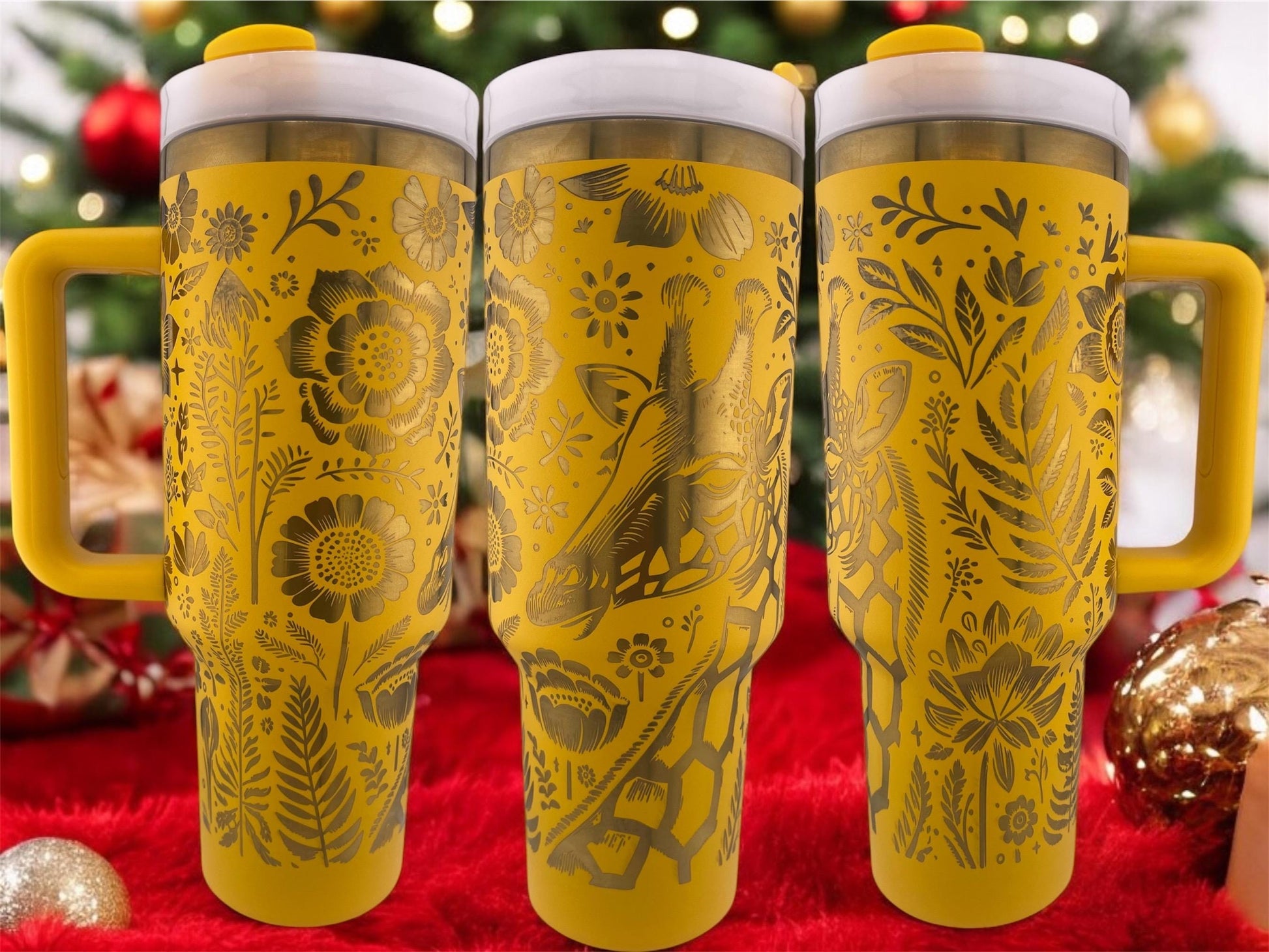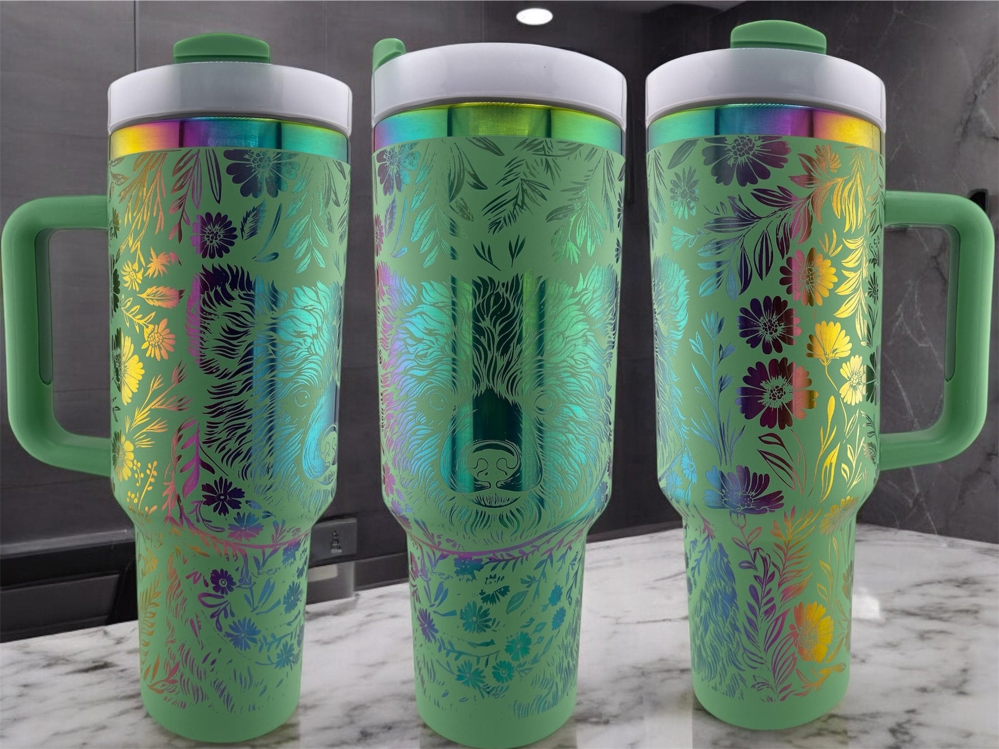 Engraving reveals silver, gold, or iridescent patterns depending on the tumbler color