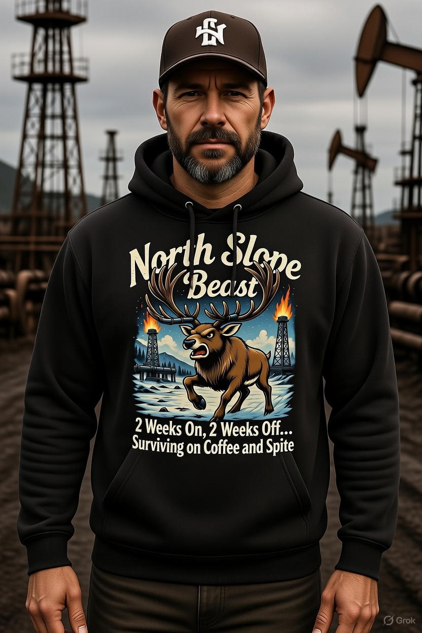 Unleash the North Slope Beast! A raging demonic caribou charges between burning flare stacks with the motto every roughneck lives by: "2 Weeks On, 2 Weeks Off… Surviving on Coffee and Spite." Pure Alaska oilfield attitude under starry skies.