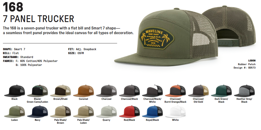 The 168 is a contemporary-styled seven-panel trucker with a flat bill, popular with today's fashion-forward headwear fans. The Hi Pro shape and seamless front panel provide the ideal canvas for all types of decoration.