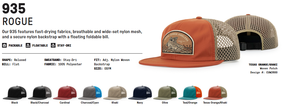 Inspired by the white waters of the Rogue River—one of eight rivers originally protected by the Wild and Scenic Rivers Act of 1968—our 935 features fast-drying fabrics and breathable, wide-set nylon mesh. A secure nylon backstrap and floating foldable bill make this a difficult cap to lose…even when the going gets tough.