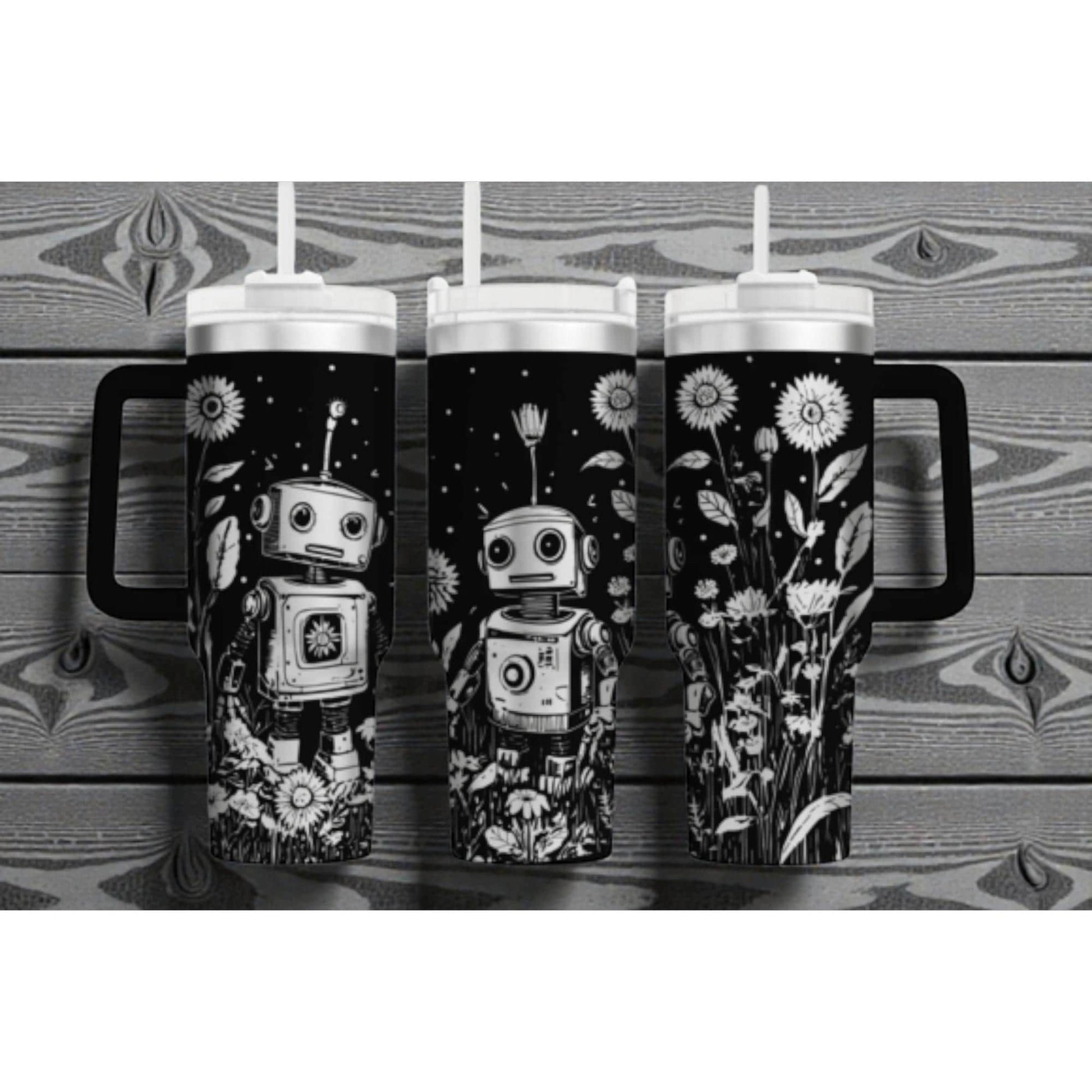 Robot & Wildflower Tumbler Wrap – 40oz Handled – Retro Bot in Floral Garden