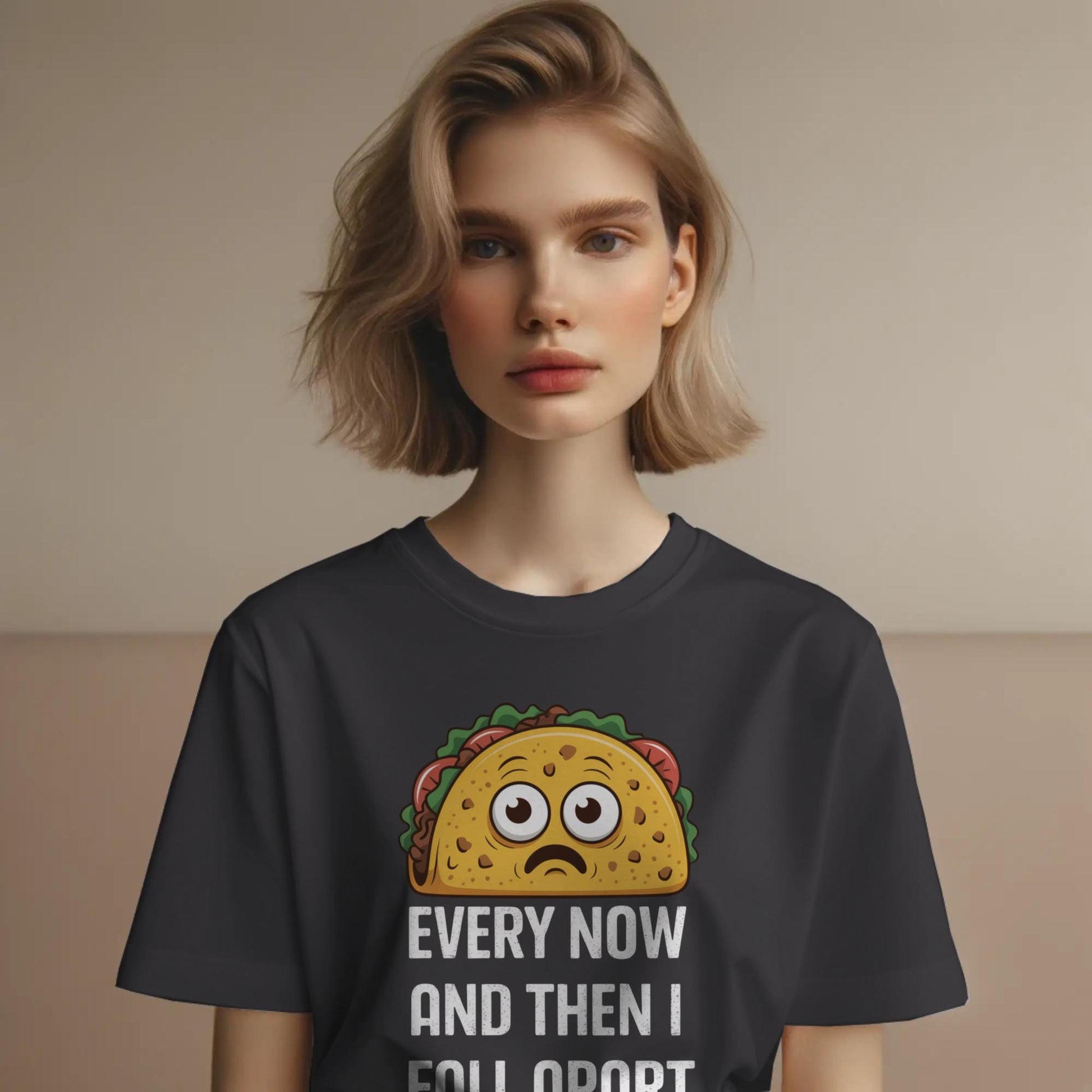 When your taco falls apart—and so do you. This hilarious t-shirt features a cartoon taco with a heartbroken expression and the punny phrase “EVERY NOW AND THEN I FALL APART,” blending food humor with a nod to classic lyrics. It’s perfect for taco fans, pun lovers, and anyone who’s ever had a moment (or a tortilla) crumble under pressure. Printed on a soft green shirt, this design is ideal for casual wear, Taco Tuesday, or gifting your favorite emotional foodie. Whether you're laughing through the chaos or just vibing with your taco soul, this tee brings flavor and feels.
