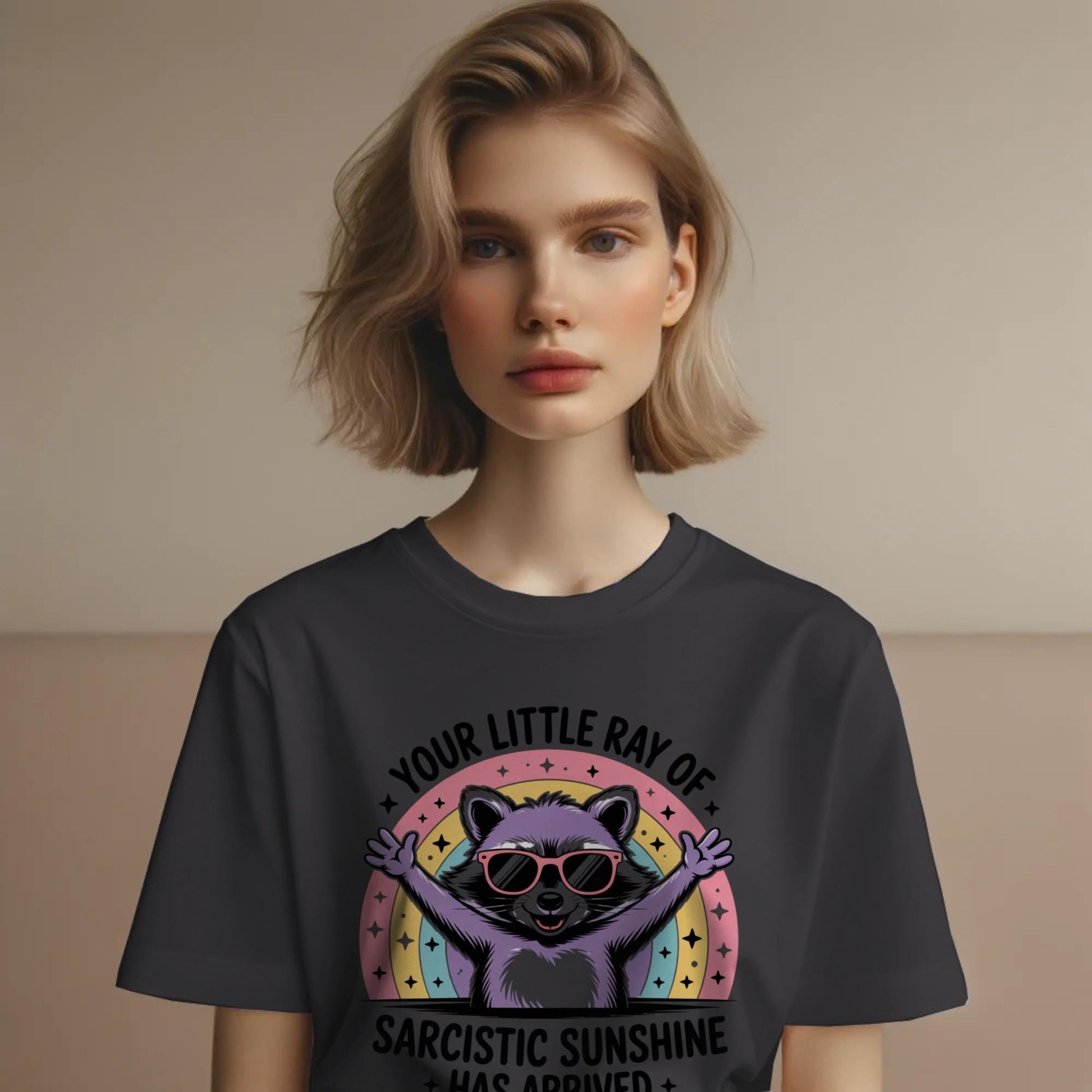 Sarcastic Sunshine Raccoon T-Shirt – Funny Rainbow Animal Tee – “Your Little Ray of Sarcastic Sunshine Has Arrived”