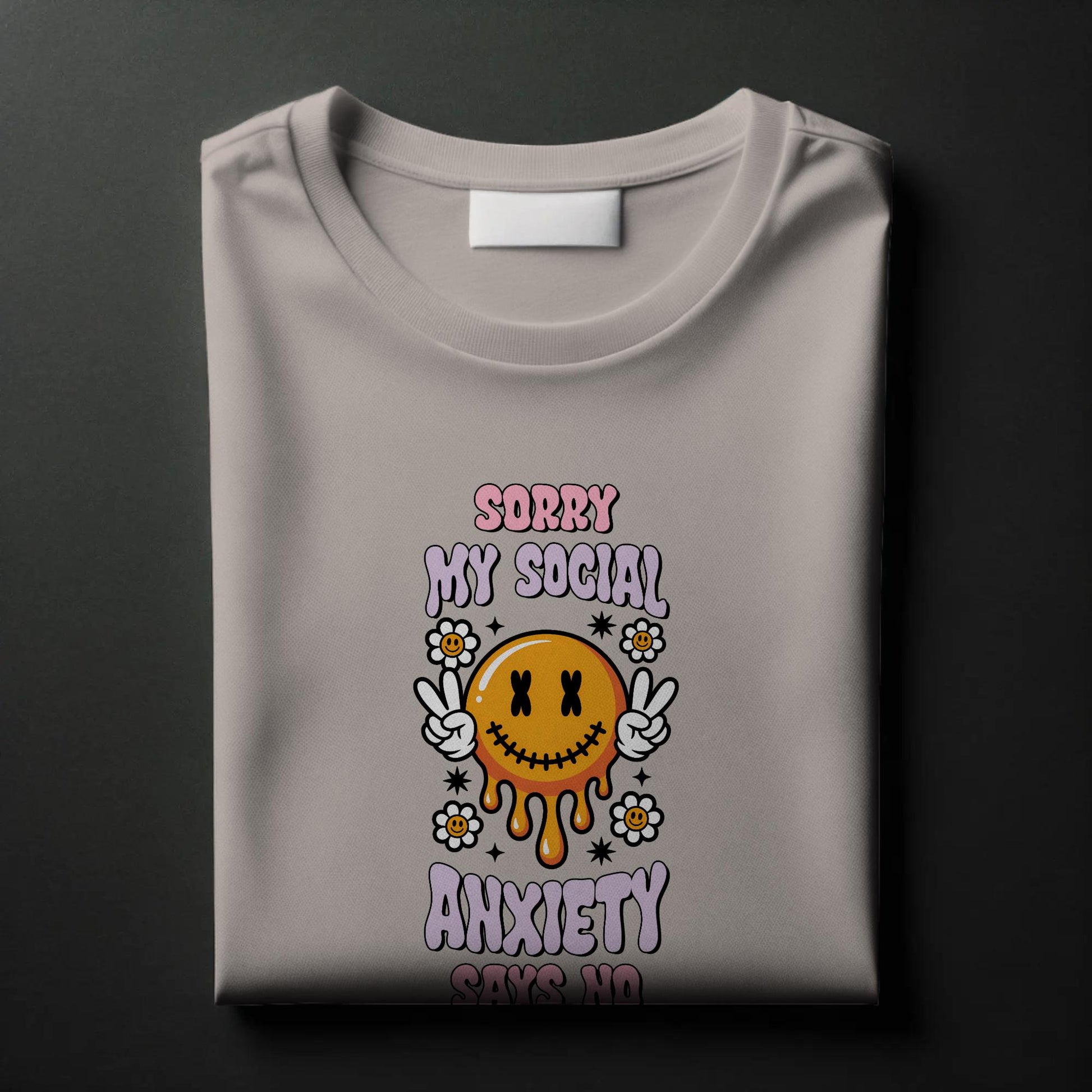 Social Anxiety T-Shirt – “Sorry My Social Anxiety Says No” – Melting Smiley Face Tee with Peace Signs & Flowers