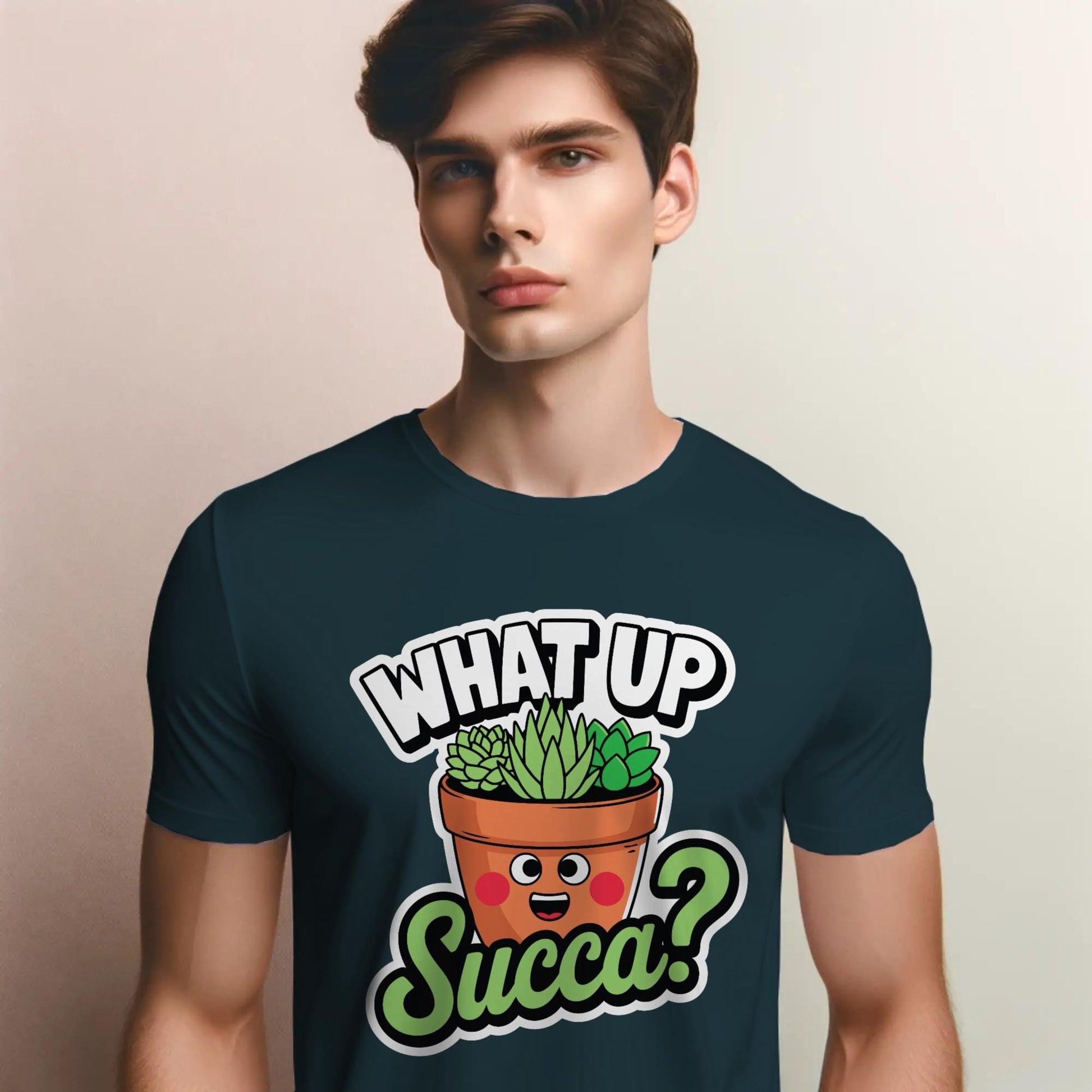 Say hello to your new favorite plant pun! This cheerful t-shirt features a smiling cartoon succulent in a pot, surrounded by playful sparkles and the hilarious greeting “WHAT UP SUCCA?”—a clever twist on casual slang and succulent love. It’s the perfect tee for gardeners, plant moms, pun enthusiasts, and anyone who thrives on sunshine and sass. Printed on a soft green shirt, this design is ideal for casual wear, gifting your favorite plant parent, or showing off your succulent obsession with style and humor.