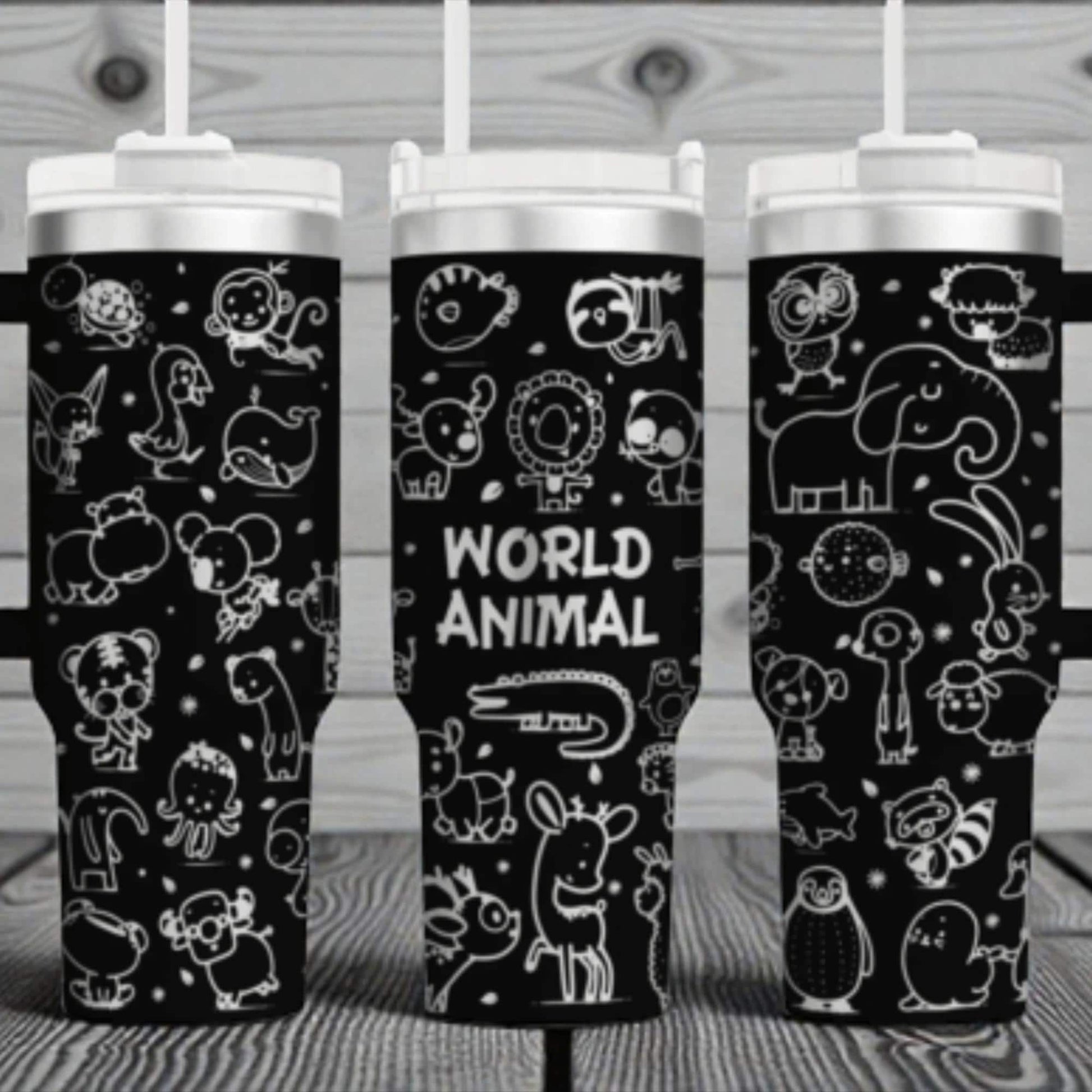 Celebrate the wild side of life with this adorable tumbler wrap featuring a parade of cartoon-style animals—from lions and elephants to penguins, crocodiles, monkeys, and more! With bold white illustrations on a sleek black background and the phrase “WORLD ANIMAL” front and center, this design is perfect for animal lovers of all ages.